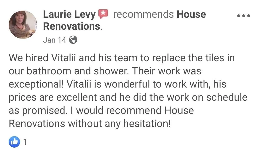 Working with Vitalii and his teem on my bathroom remodel was an absolute pleasure. Vitalii is a very knowledgeable and experienced contractor. Moreover, he is a very humble and kind person.